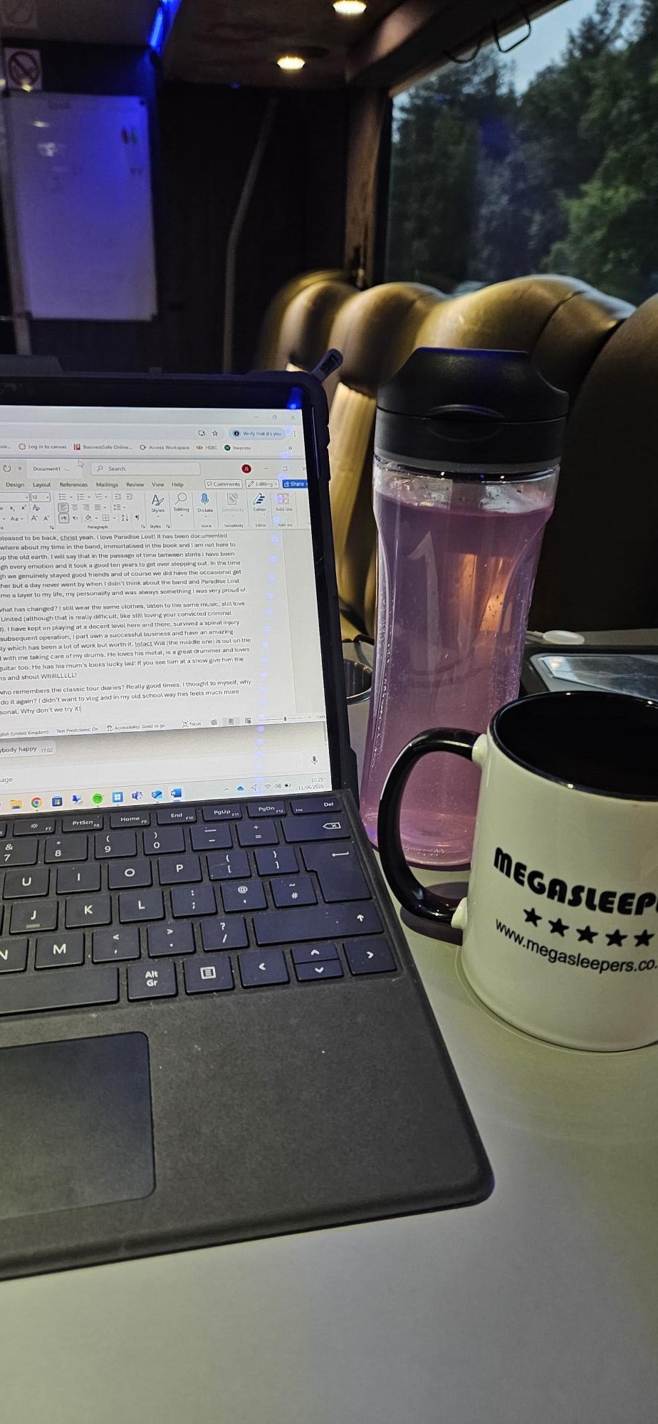 Basic needs on a tour. Sleep, food and a shower. I have to say the catering on this tour has been nothing short of excellent. Our get in is at midday so I am up earlier than everyone else, normally just after the Vampire (Aaron Aedy) has gone to bed. I do some work, as I part own a business in the UK and am working remotely, while I have a brew and then I go to check out the venue. There is a big crew on the tour so catering is pretty extensive. Coffee, tea, juices, breads, cereals and then there have been sometimes up to five choices on lunch apart from salads and cakes. It is brilliant and I am very grateful. I don’t like to eat before a show so I tend to have a salad around 6 with a little pasta and I don’t put away something substantial until after the show.